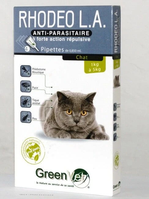 La pipette Rhodeo chat est un complexe original de diffeÌrents principes actifs dâorigine naturelle qui exercent leurs activiteÌs antiparasitaires dans les 24 heures qui suivent sa mise en place et dont lâeffet se poursuit sur une peÌriode de 1 mois en milieu normal.